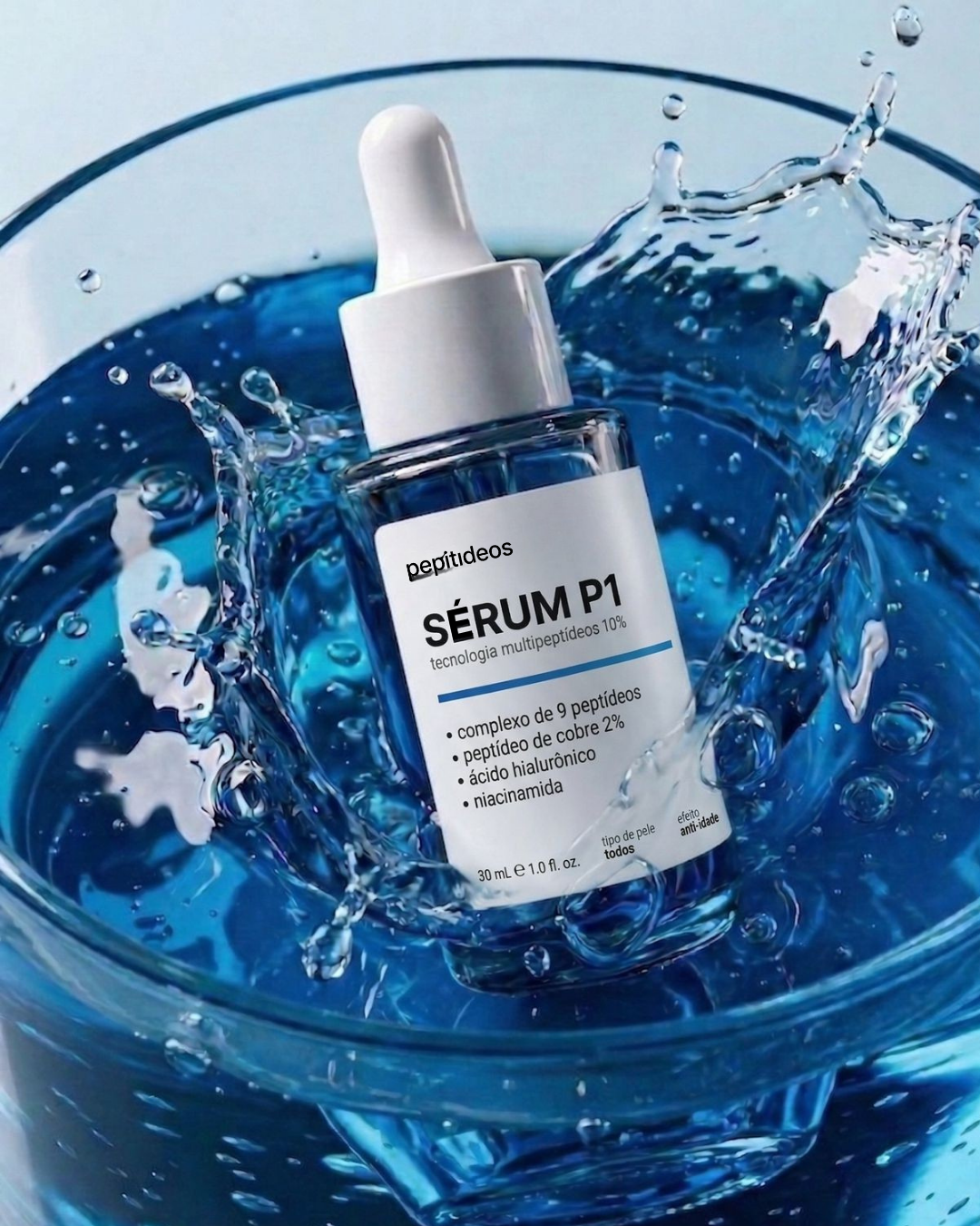 Complexo de 9 peptídeos. Ácido hialurônico. Niacinamida. GHK-Cu a 2%. Tudo em um sérum azul que a sua pele já reconhece.